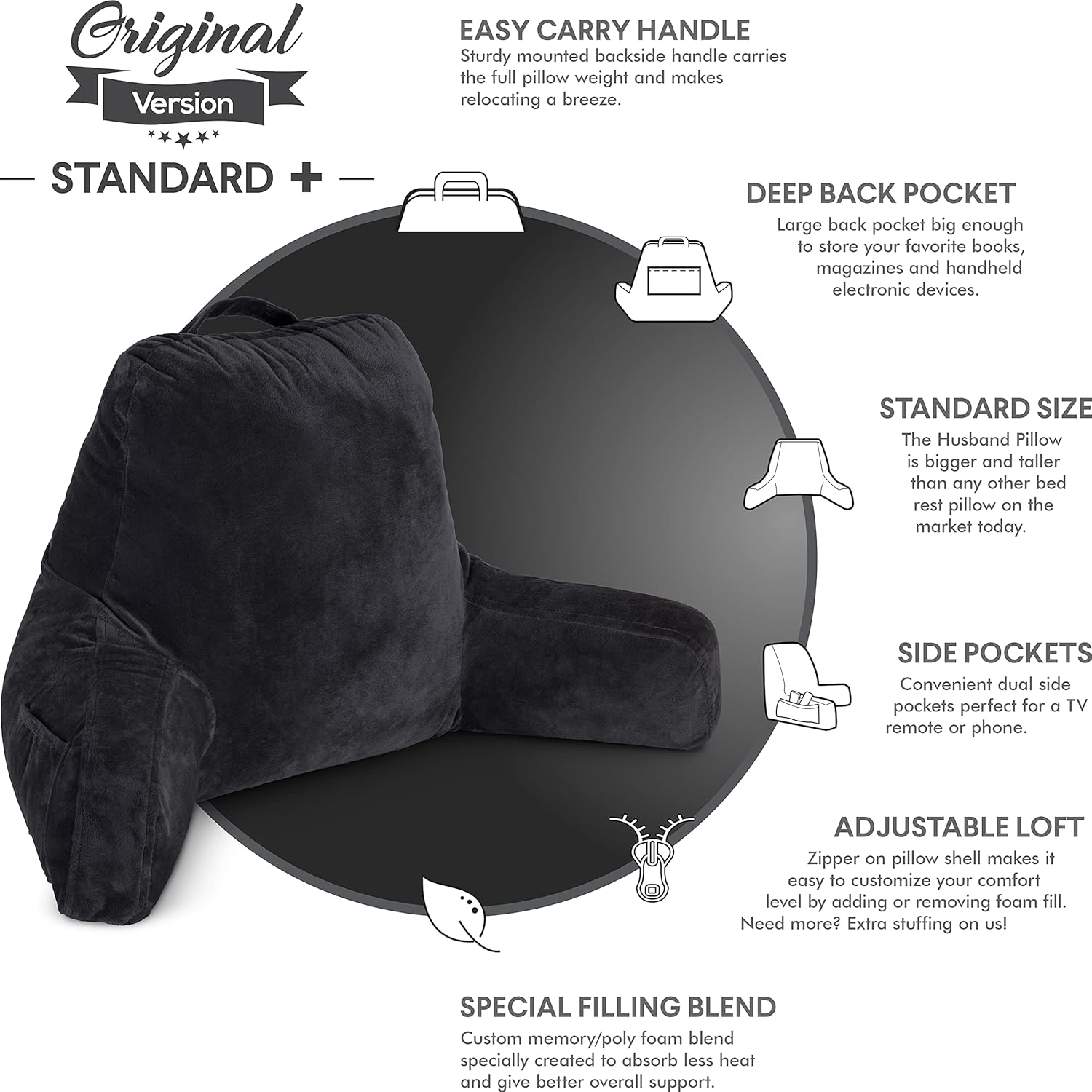 Husband Pillow Black, Original Reading Pillow in Bed Rest Chair, Shredded Memory Foam Large Lounge Cushion Adult Backrest with Arms, Comfy Back Support for Sit Sitting Up, Washable/Removable Cover
